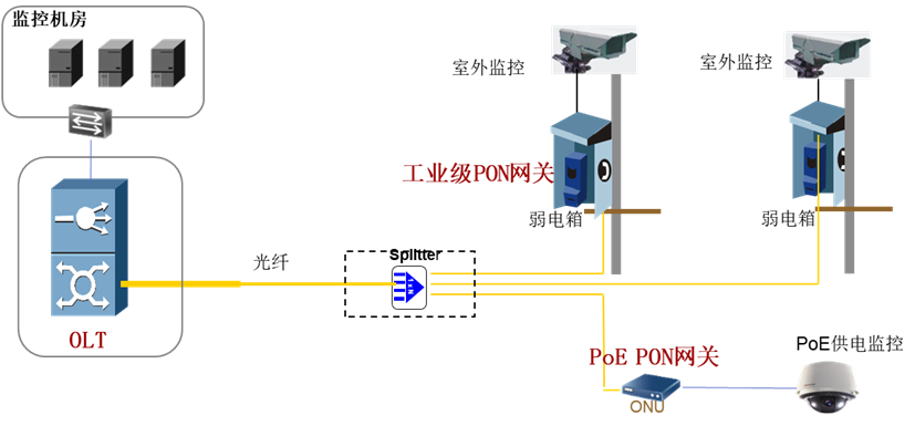 监控功能:室外监控通过部署在室外弱电箱的工业级PON网关来接入监控摄像头实现,室内监控通过部署在弱电井/配电间的POE PON网关接入监控摄像头实现;工业级PON网关和POE PON网关均通过分光器接入大楼中心机房OLT。