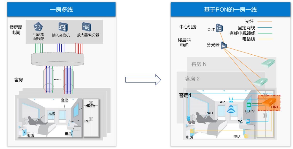 综合布线:弱电间到办公室间的综合布线将从传统的一房多线变为一房一线、一纤三波、一网多能,简化现有网络结构,节省布线成本,实现统一运维。