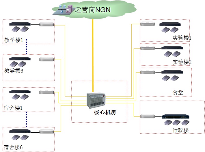 欧博官网-(中国)官方网站在学校行政楼放置一套IPPBX融合通信系统作为语音接入汇聚设备,通过SIP中继接入到运营商NGN语音网络。 教学楼和实验楼内分别放置IPPBX远端扩展模块,每台扩展模块预留扩展接口,满足以后的扩容需求。