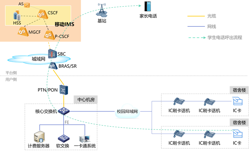 部署在中心机房的软交换服务器、计费服务器和校园一卡通系统通过学校内网实现IP互联,学生通过校园一卡通在IC刷卡话机上刷卡后输入电话号码,即可完成对外呼叫。