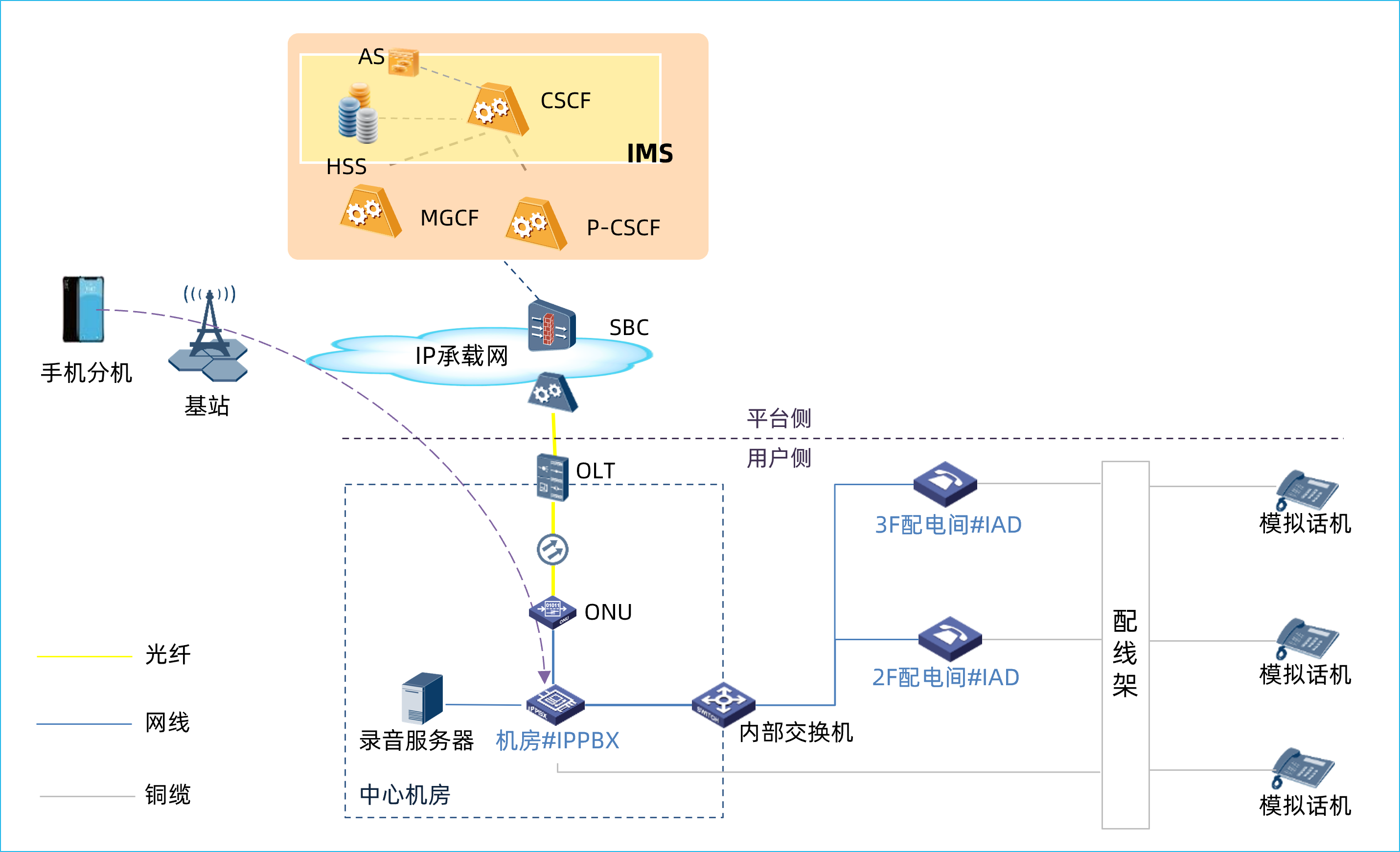 (1)在商场中心机房部署一台IPPBX语音交换机和两台IAD综合接入设备。IPPBX上行通过语音专线接入至运营商IMS网络,提供全网呼叫处理,实现内外线呼叫功能。