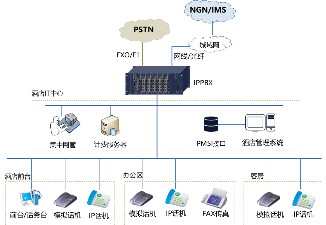 IPPBX融合通信系统,通过E1接口连接至移动/铁通公司网络;系统实现行政分机和客房分机群组,提供内部语音和电话会议业务。 前台话务员使用的IP软话务台与酒店管理系统配合,可以执行客房电话权限开通、呼叫转接、夜服、免打扰、留言等功能。行政办公人员WIFI分机可以通过无线网络接入到融合通信系统,实现移动办公。