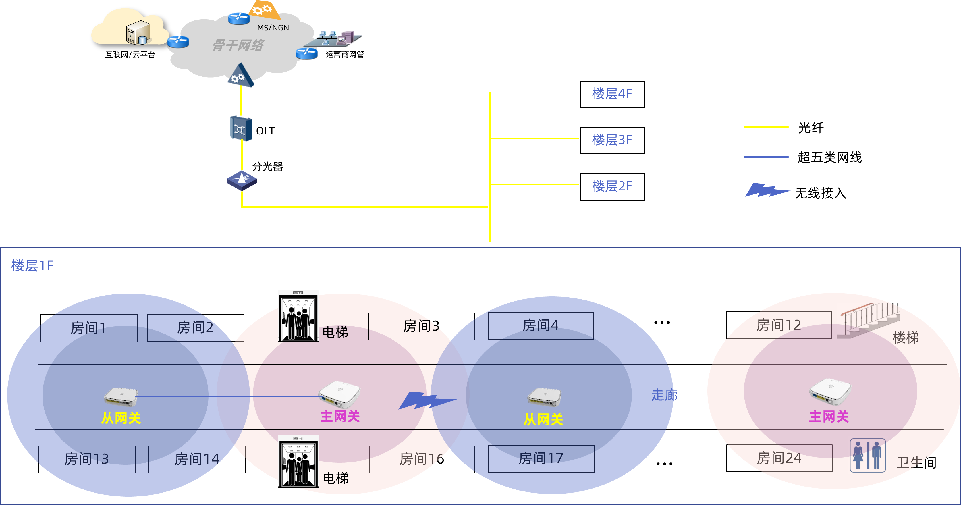 ②Mesh主网关是企业内部网络的互联中心,上行通过以太网口或PON口接入客户侧出口设备OLT;Mesh从网关是网络接入节点,扩大了无线网络容量和覆盖范围。