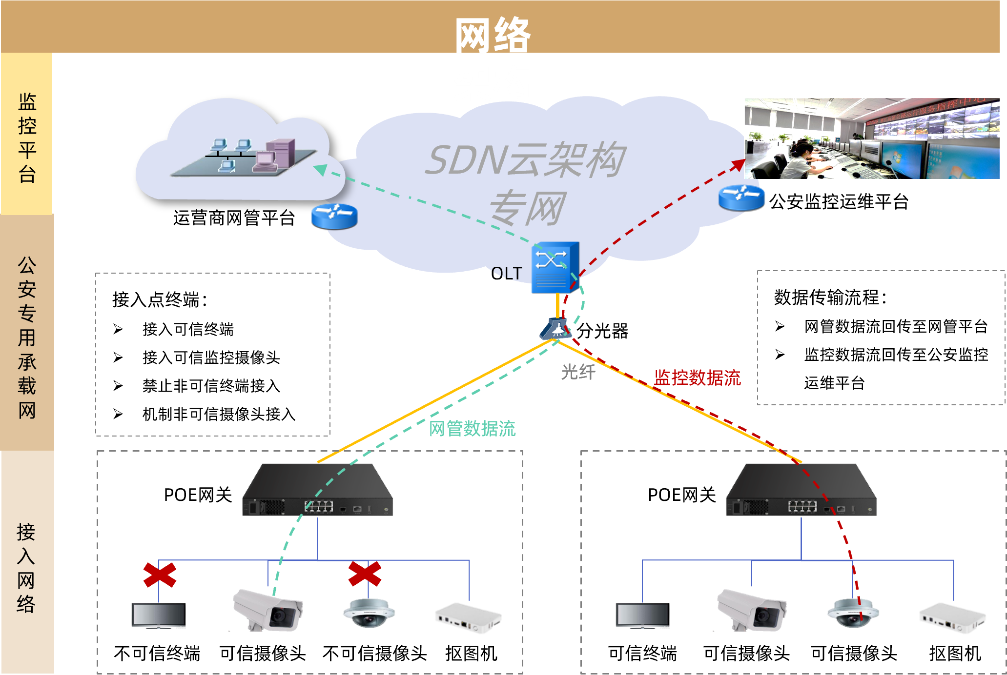 以光纤接入的标准末端接入网关(PoE网关)为最小单元,通过交换节点构建视频监控平台,形成公安监控视频专网;公安监控平台具备对区域接入网关的设备监控管理、监控探头管理、资源分配以及能力调度。