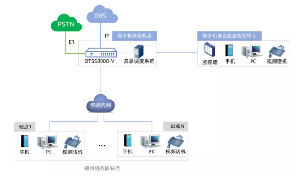 1.在新乡铁路段机房部署一台OTSS8000-V,设备通过FXO外线与模拟中继进行对接,承载内外线话务功能。