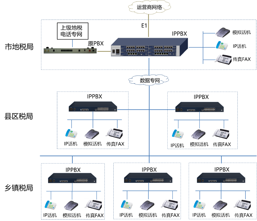 根据行政区域将语音专网系统分为三级结构,市局为一级核心交换局点,县区局为二级汇聚局点,乡镇局为三级接入局点。市局部署IPPBX语音交换机,通过数字中继和移动专网对接,作为全局的市话、长途的出口;通过数字中继和原PBX实现对接,连通到上级地税电话专网。县区局各部署小容量IPPBX,接入当地所电话和传真。乡镇办公电话通过本地IPPBX远端模块接入到县局,实现县区内的通话交换。整个语音网络分层部署,号码统一分配,集中管理。内部分机通话完全免费,分机和移动手机V网短号互拨,享受移动的资费优惠。