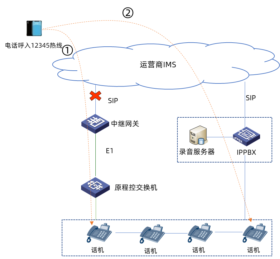 嘉兴市现有12345热线通过程控交换机承载话务功能,如上图所示,原程控交换机通过RJ11铜缆下联话机,通过E1线路上联中继网关接入运营商IMS,作为主线路(①号链路)使用。IPPBX采用SIP协议,通过以太网口注册至运营商,承载IMS业务和端口号码的下发,形成应急链路(②号链路)。应急链路平时处于待机状态,如果主线路因故障出现问题无法接通电话,则紧急启动应急链路,保障呼入呼出线路畅通,实现业务的连续性。