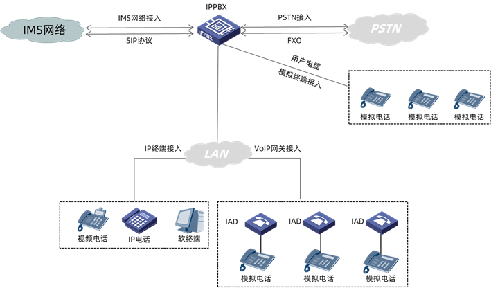 IPPBX(IP-Private Branch Exchange,语音交换机),设备支持IP中继接入运营商的IMS核心网、通过模拟中继接入PSTN(Public Switched Telephone Network,公用电话交换网),IPPBX支持接入IAD、模拟电话、传真机、POS机和IP话机等终端,能够提供强大的语音功能和电话业务。