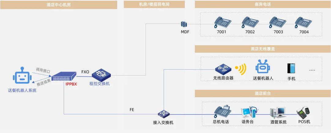 通过在酒店中心机房部署1套提供FXO接口的IPPBX,承载语音接入和号码资源,下行对接客户旧有程控交换机,并提供外线呼入呼出、分机账号分配和权限控制等功能及基于IP的应用拓展及对接,实现机器人系统与酒店话务系统的联动作业。