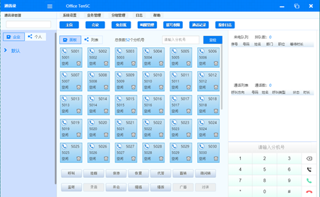 OTSC话务台安装在PC上,具备常用的话务管理功能(侯线/保持/转接/代答/强拆/留言),可实现通讯录、电话状态监控、通话记录查询、分机拨号权限修改、免打扰、叫醒、夜服、业务操作日志查询等功能。