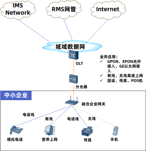 融合企业网关是针对中小微企业(包括商铺、酒店)的通信、办公和娱乐需求,集成“光猫+路由+固话+电视+行业智能应用“等功能为一体的互联网终端接入设备。融合企业网关 旨在为客户提供包括互联网电视、流量管理、上网行为管理、企业应用等多种服务的一体化综合接入方案。智能企业网关可以通过“1根宽带+ 1个盒子+1个平台+ N个应用” 打包解决企业信息化需求,构建统一智能办公生态体系,实现一个网关设备“管理企业的一切连接”。